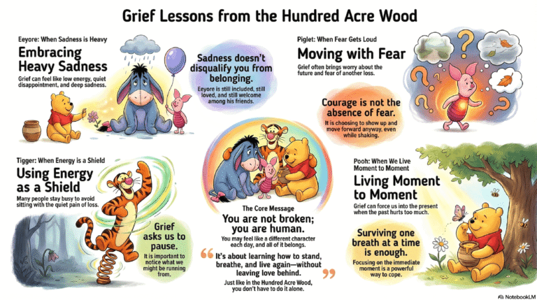 Some days you may feel like Eeyore. Other days like Piglet or Tigger. All of it belongs. All of it is welcome. Grief is not about moving on from someone you love. It’s about learning to carry that love differently, to stand, breathe, and live again without leaving love behind.